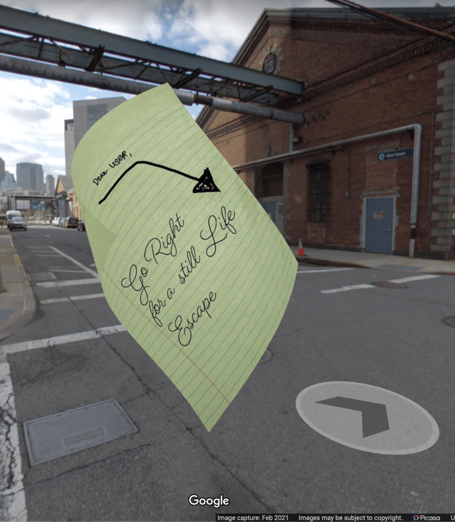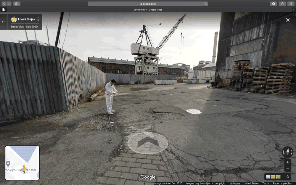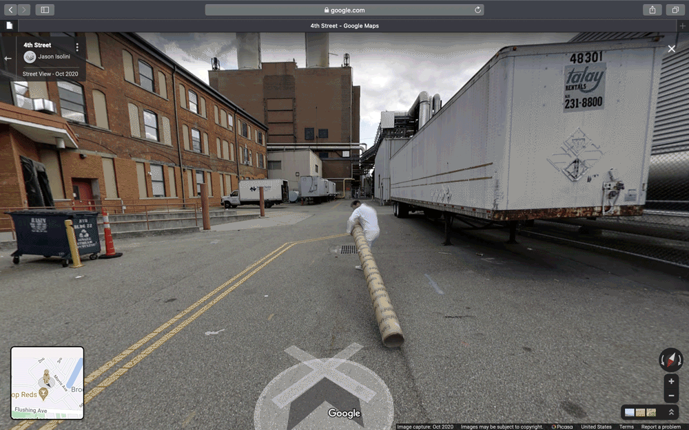 Throughout the Navy Yard there are about 20 to 25 different trajectories that connect different elements of this story. In one direction a viewer may see Loosii Ninjas surfing on a print-media-tube he’s escaped with from the print facility. In others, one may stumble upon him pushing an entire still-life down the street. All together these gestures are meant to change the context of the tools typically used in the print and photography environments they come from, and in doing so, animate the mundane industrial space of the Navy Yard. In terms of the piece “Still-Life Escape” as I call it, the white backdrop used for commercial photography becomes the vehicle for performance. What has most excited me about these kinds of interventions is that the space itself feels like a film set. During most of 2020 when I shot this work, I had the space to myself, whilst only periodically having to explain what I was doing to a security guard passing by — it’s not illegal to photograph in the Navy Yard. However, utilizing the technology of Google Maps for my personal interests, I’ve come to straddle two positions of agency — I am an artist who is both acting with and against Street View. Simultaneously, I’m functioning symbiotically with Street View to capture uncharted territory, and without specific permission within private/public space as Google always has. Since I am the first person to capture this space I hold a form of ownership that in some ways subverts the purpose of Street View — my Image-sphere’s are works that I’ve archived, and hold intellectual property over. It may be fair to say that within the comedic actions of my character, the meaning of the work may lean towards image rights over virtual territories. However, that may be an adventure the viewer needs to discover themselves.